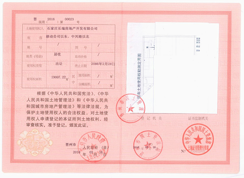 热烈庆祝石家庄长瑞取得《国有土地使用证》